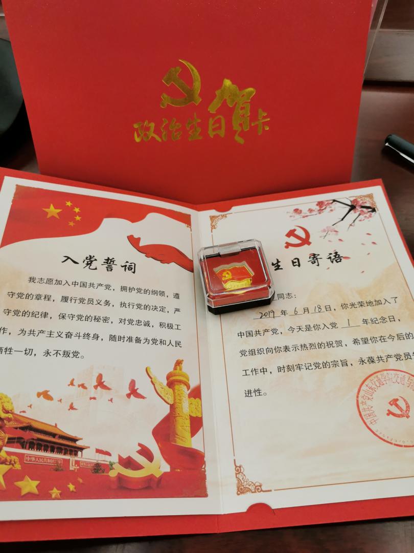 这一天,也是15名毕业生党员和4名非毕业生党员的“政治生日”。会上,党组织为这19名同志举办了这场特殊的政治仪式,并赠送了政治生日贺卡,表达祝贺和问候。