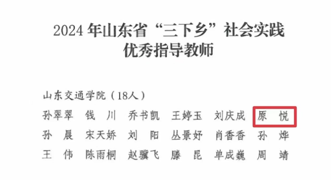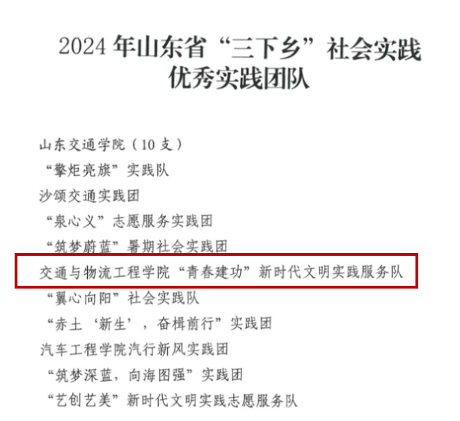 近日,中共山东省委宣传部等四部门联合发布2024年暑期"三下乡"社会实践表彰通报,我院教师原悦、学生戴睿智分别荣获 “优秀指导教师”和“优秀学生”荣誉称号, 学院“青春建功”新时代文明实践服务队获“优秀实践团队”称号,"青春建功,守望麦田"交通报国黄河行实践项目荣膺“三下乡”特色品牌项目。
