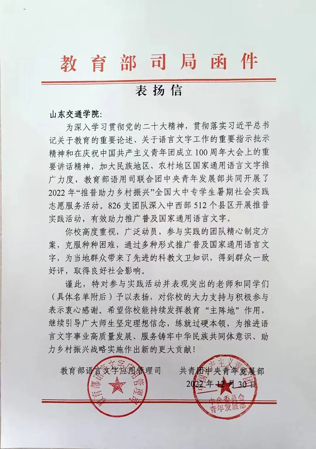 近日,教育部语言文字应用管理司、共青团中央青年发展部共同主办的2022年“推普助力乡村振兴”全国大中专学生暑期社会实践志愿服务活动评优结果揭晓,我院“‘守望麦田’”获“优秀团队”称号,并获教育部语言文字应用管理司、共青团中央青年发展部来信表扬。