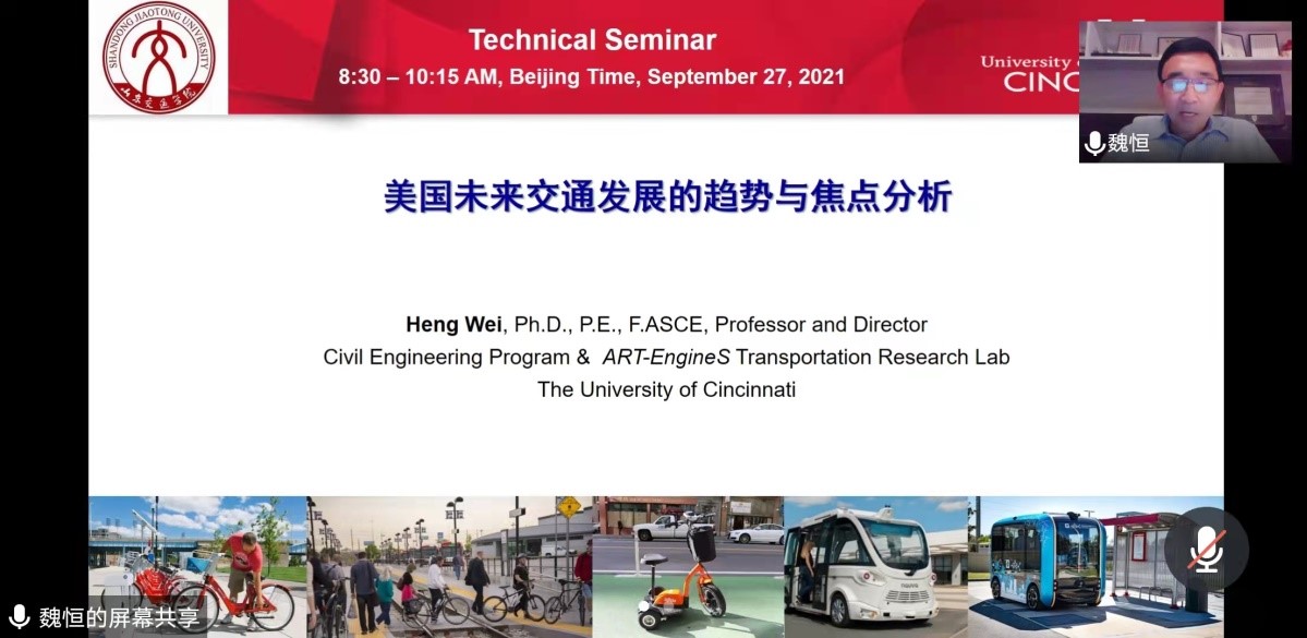 本次活动采用线上会议形式召开,邀请了国内外智能交通领域的知名学者作报告,300余名师生参会。日本丰田都市交通研究所教授级研究员安藤良辅先生作了题为《日本的智能交通系统(ITS)的发展》的报告,以日本当前智能交通现状为切入点,剖析了智能交通技术在日本交通系统中的应用情况。东南大学王昊教授报告题目为《智能网联异质交通流特性与分析方法》,针对智能网联环境下的交通流特性、基本图模型及稳定性等研究成果进行交流。美国辛辛那提大学魏恒教授以《美国未来交通系统发展的趋势与焦点分析》为题,从网联车、自动驾驶车、交通大数据分析、混合交通流控制等多个方面,对美国智能交通系统未来发展趋势进行了报告。三位学者针对智能交通行业有关热点和学术问题,分别与师生进行了有益的交流与探讨。