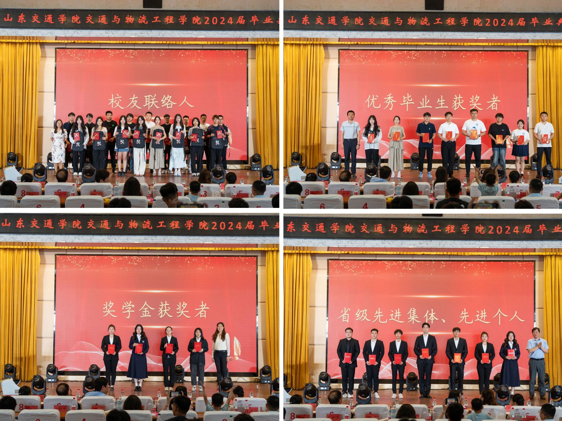 毕业典礼上,学院党委副书记、院长张萌萌与毕业生深情话别,她寄语毕业生们要锤炼品德,做人品才学的修炼者;要心怀家国,做理想事业的追求者;要不负时代,做交通强国的践行者,努力将个人追求与祖国发展紧密融合起来,到祖国需要的地方去,到党和人民期待的岗位上去,为国家交通物流事业的发展做出更大贡献。随后,学院党委副书记李晓宣读“山东省优秀班集体”、“山东省优秀毕业生”、“山东省优秀学生干部”的表彰通报,表彰学生代表上台领奖,学院领导及教师代表为其颁奖。毕业生代表交控201班刘徐通回顾了四年来学院和老师对自己的关怀与培养,并表示,无论走的多远,都将始终秉承“明德至善、格物致知”的校训精神,不负韶华,勇毅前行,在新征程上续写交院学子奋进新篇章。