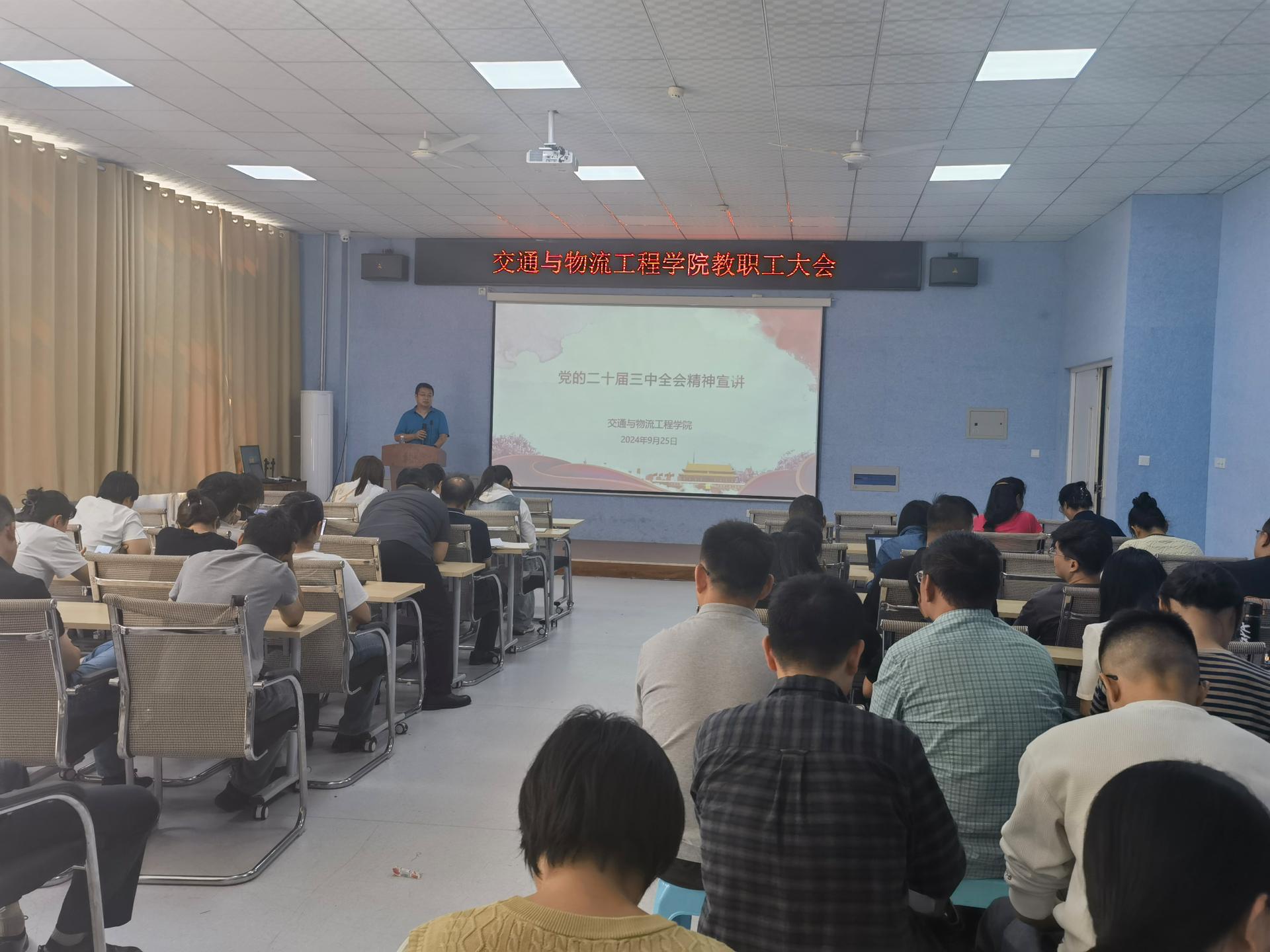 9月25日,太阳网集团tcy8722党委书记李保宏在交通机电楼A101开展二十届三中全会精神宣讲,学院全体教职工参加会议。