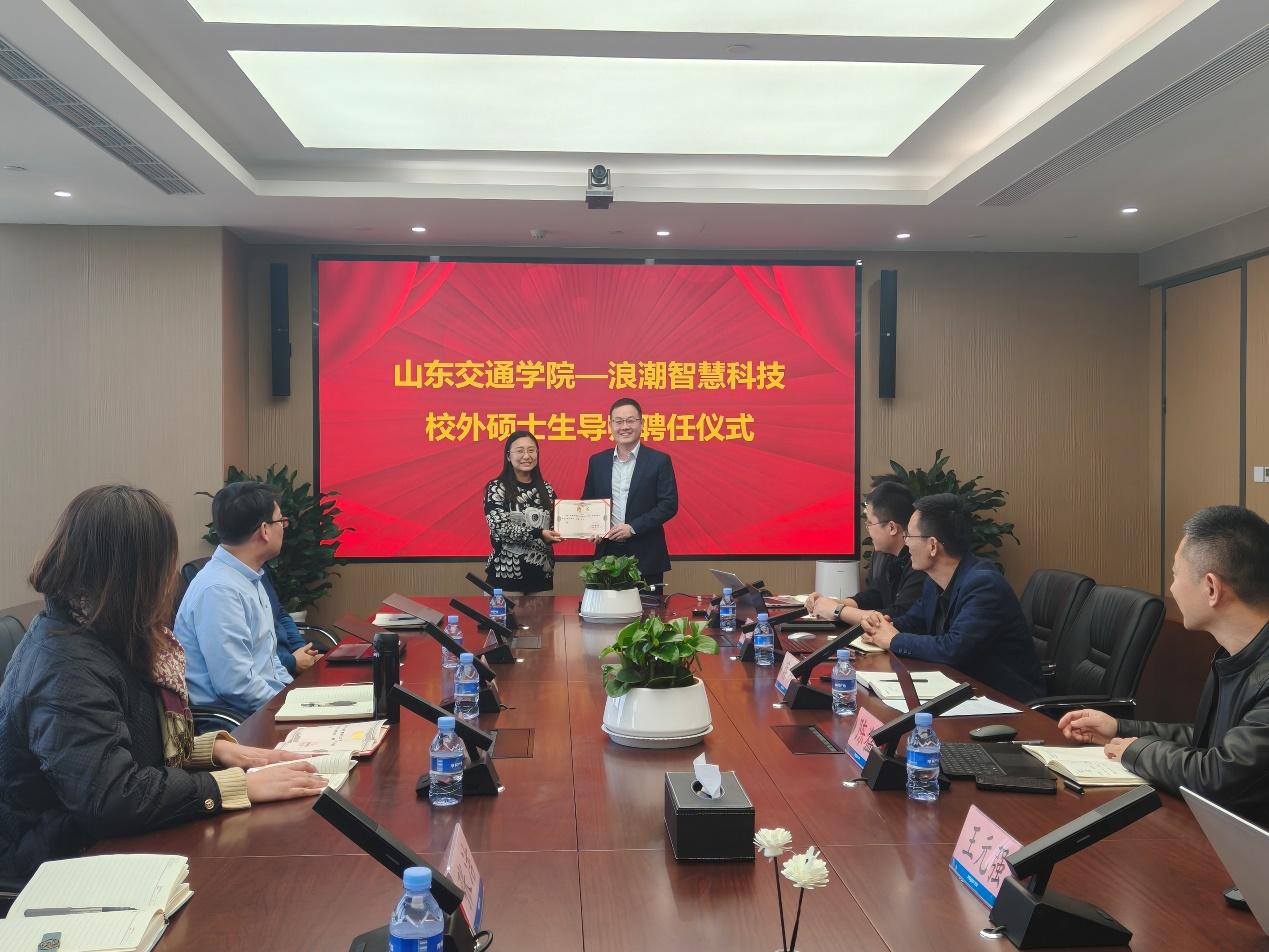 张萌萌院长充分肯定了近年来双方合作的成果,并且对浪潮集团为我学院培养研究生做出的努力表示感谢。会上举行了简短的研究生校外导师聘任仪式 ,张萌萌院长代表学校向我校聘任的研究生校外导师蒋庆、王柯颁发了导师聘书。