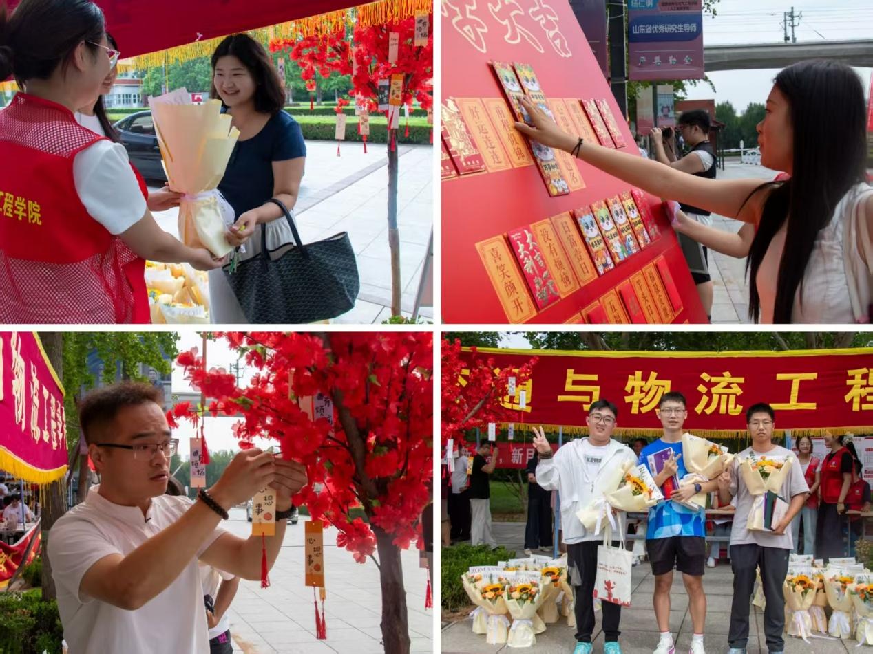 为增强研究生新生的归属感和参与感,学院特别设立了“许愿树”“抽红包”“赢福卡”“赠鲜花”环节。在许愿树前,新生们在许愿卡上认真写下对研究生阶段的学术目标、生活愿景,五彩斑斓的卡片随风轻摆,昭示着他们对新阶段的美好期待;“抽红包” 环节更添惊喜,红包内是对新生满满的祝福和期待,大家忍不住和身边人分享喜悦,现场笑声不断。当新生完成报到流程后,志愿者会双手递上一束精心包装的鲜花,当他们接过鲜花时,脸上洋溢着感动的笑容,不少人立刻拿出手机,与鲜花、校园合影,定格下这份独特的入学记忆。