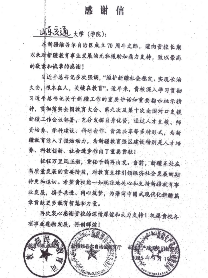 四位援疆干部先后获得山东教育援疆优秀个人、山东援疆优秀共产党、优秀援疆教师、山东援疆示范项目、山东援疆优秀党务工作组等多项荣誉称号,得到高度肯定。学院获教育部民族教育司感谢信。