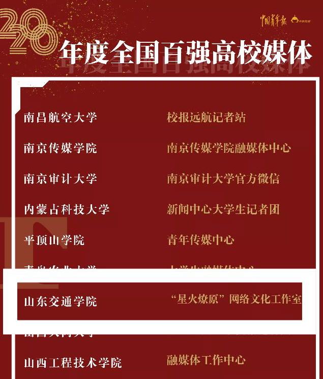 近日,在中国青年报社、中国青少年新媒体协会、中青校媒联合举办的“高校新闻扶持计划” 寻找全国百强校园媒体活动中,太阳集团tcy8722“星火燎原”网络文化工作室荣获“2020年度全国百强高校媒体”称号。